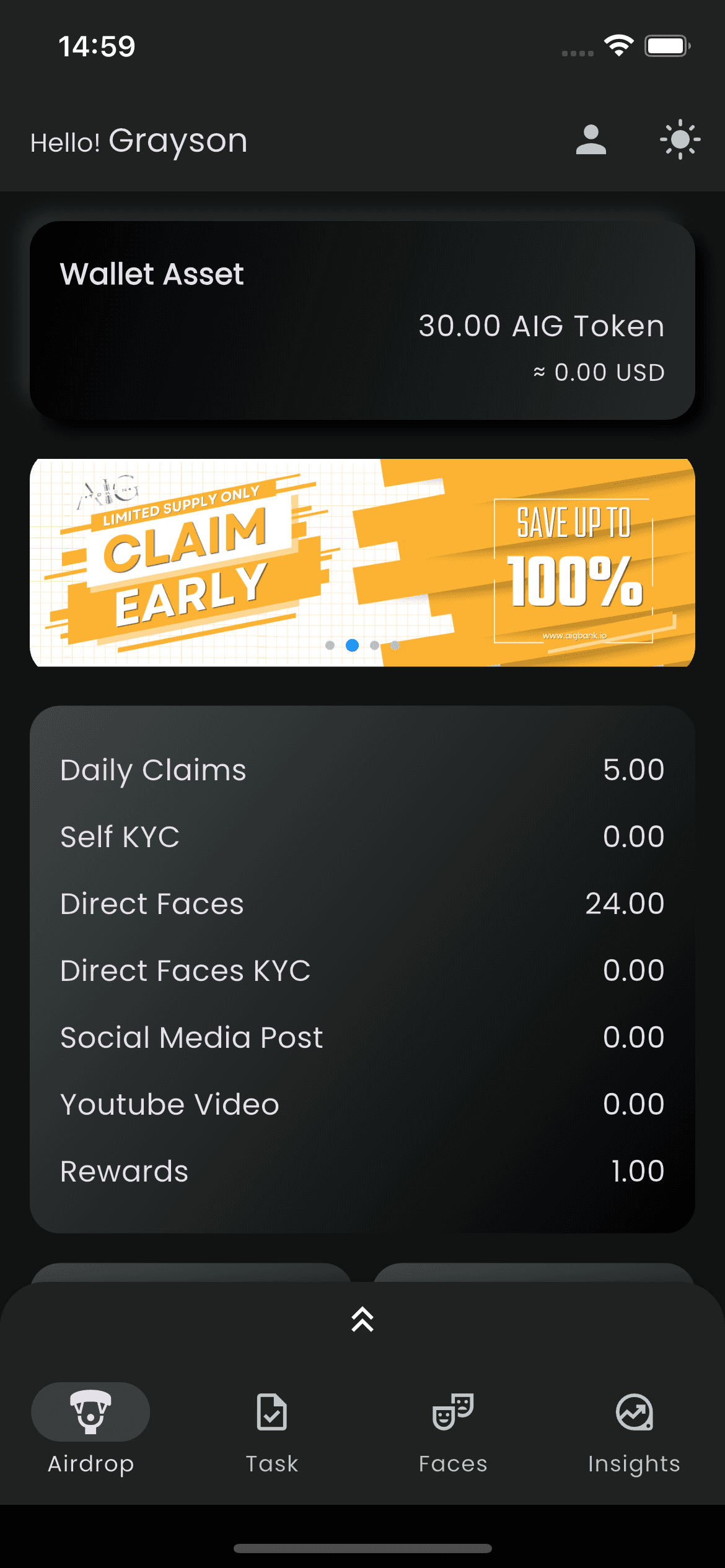 The AIG Token App lets you earn rewards through daily tasks, content sharing, and video submissions. Explore features like Faces for community recognition and Insight for tracking your token journey.